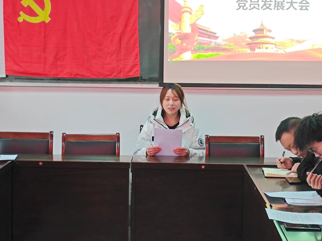 会议伊始,第二党支部书记陈玉琴宣读发展对象名单,并就本次大会的流程、注意事项作了详细说明。首先,发展对象逐个向大会汇报对党的认识、入党动机、本人履历、现实表现以及向组织说明的其它问题;其次,介绍人介绍发展对象的培养情况,并对其能否入党表明意见;第三,支部组织委员张宁介绍支部审查情况,纪检委员张绍军介绍支部征求党内外群众意见和公示情况;第四,与会党员充分发表意见、对申请入党人能否入党进行讨论;第五,进行无记名投票表决,形成支部大会决议;第六,支委会根据票决结果提出意见,提交支部大会讨论通过,形成支部大会决议,宣读表决决议;第七,申请入党人对大会讨论情况表明自己的态度。通过以上流程,最终付然、赵鸿飞、张杨雪、张凤娟4名同志全票通过,成为预备党员,并上报上级党组织批准。