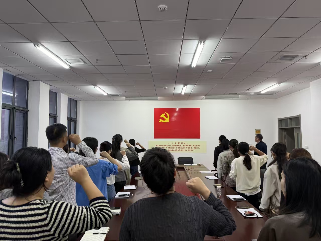 会议进行第二项:全体党员列队面向党旗,由第二党支部书记陈玉琴同志带领全体党员重温入党誓词。