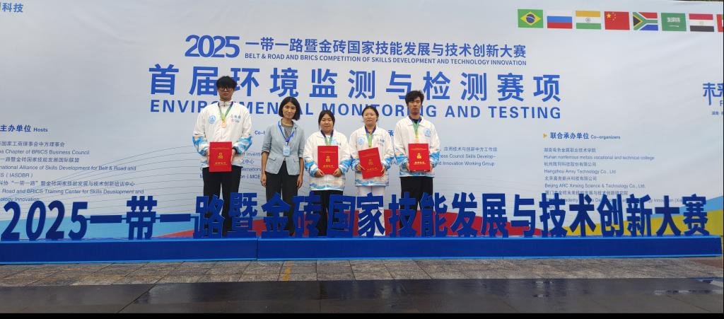 2025 年 10 月 17 日至 19 日,一带一路暨金砖国家技能发展与技术创新大赛首届“环境监测与检测赛项” 在湖南有色金属职业技术学院成功举办。我院suncitygroup太阳集团环境工程技术专业学生丁思杞、张欣怡与袁帅、朱涵坤分别组成两支参赛队伍,与来自全国的210支高职组队伍同台竞技,最终凭借扎实的专业知识储备与稳定的临场发挥,两支队伍均荣获赛项铜奖,指导教师齐丽彬、高晓松也在赛事过程中积累经验、受益匪浅。