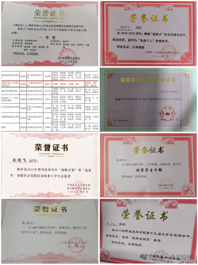 作为学生骨干,赵鸿飞始终将服务同学放在首位。他以身作则,带领班级荣获“河南省文明班级”称号;作为自管会主席,他是连接师生的坚实桥梁,连续两年获评“优秀学生干部”,充分展现了学子标杆的引领风范。