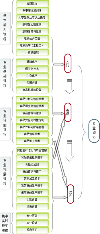 开设课程:开设有仪器分析、食品分析与检验技术、食品微生物检验技术、食品安全与质量管理、食品营养与健康、食品加工技术、食品标准与法规等骨干课程。