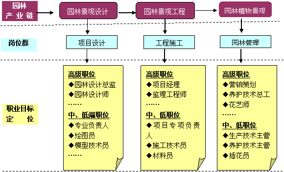 (2)园林景观工程施工过程中的职位,包括园林景观工程投标、园林景观工程概预算、园林景观工程施工一线管理、园林景观工程一线监理等。