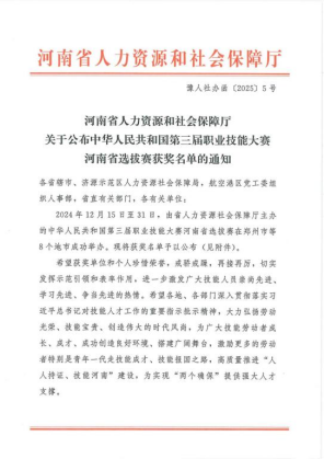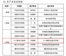 1月16日,河南省人力资源和社会保障厅公布了《中华人民共和国第三届职业技能大赛河南省选拔赛获奖名单的通知》(豫人社办函〔2025〕5号),我院齐丽彬老师作为选手、黄蓓蓓老师作为指导教师在国赛精选项目农产品食品检验赛项中获得三等奖。