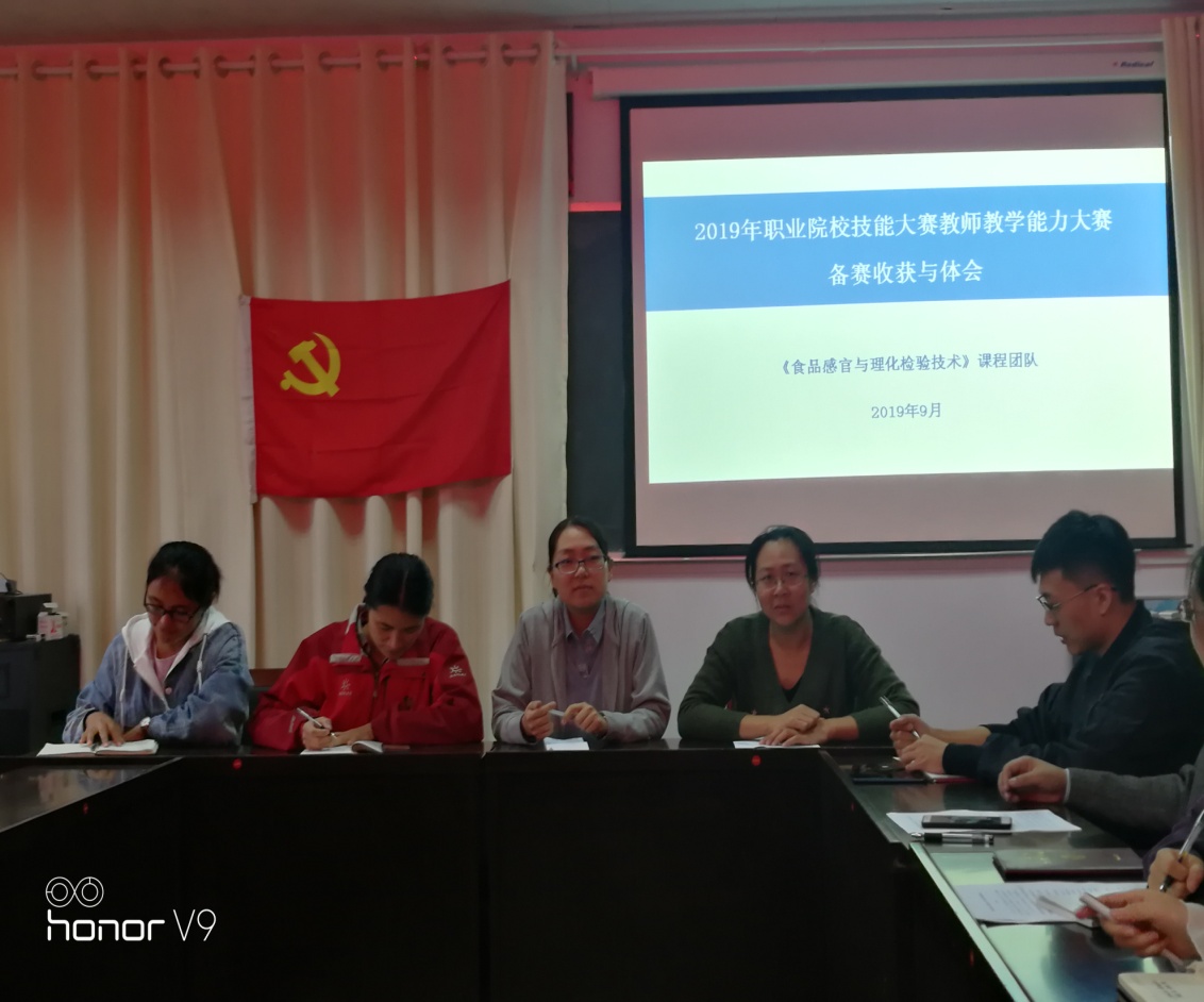 suncitygroup太阳集团自启动这项活动开始,便高度重视,认真落实。从初期的学习文件,全员参与,到后来的选拔推荐,重点培养,每一步都踏踏实实,一步一个脚印地走了过来。最终,由黄蓓蓓、石莹莹、齐丽彬、张棋老师组成的《食品感官与理化检验技术》课程团队,脱颖而出。四位老师在暑假期间辛苦备赛,期间与专家多次接触,受益匪浅。本次会议上,团队负责人黄蓓蓓老师代表课程团队发言,从接到任务讲起,详细介绍了课程选择内容设计、方案讨论、人员分工、信息化展示等环节,使全体教师了解了目前教师教学能力大赛的具体要求,评判过程,评价标准等。发言后,教师们就大赛情况提出来一些问题,课程组成员一一进行了解答。