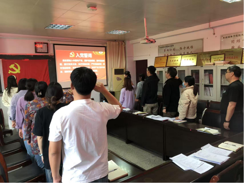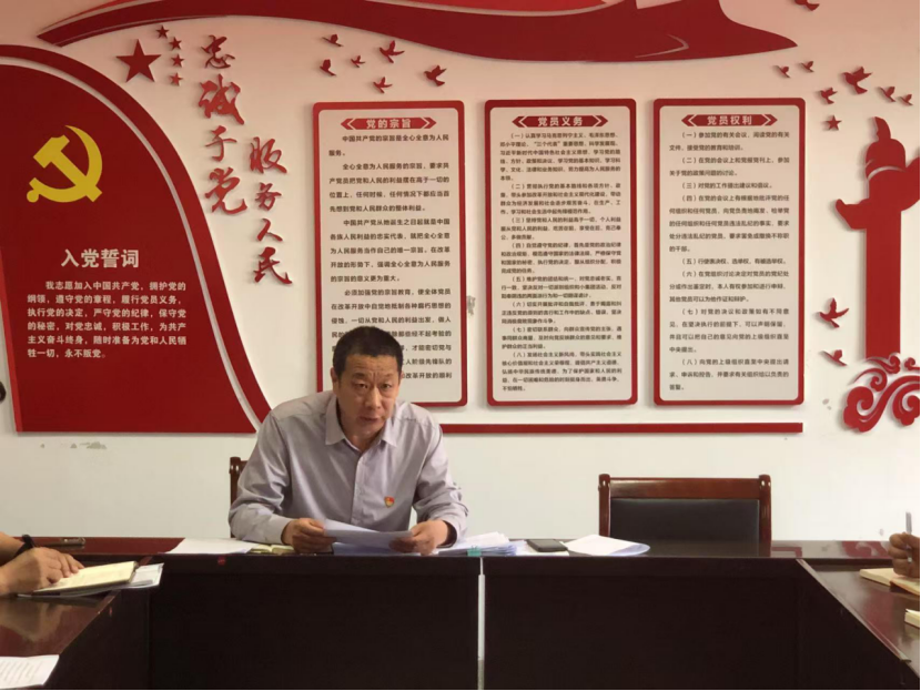 会议进行第四项:全体党员列队面向党旗,由党支部书记杨智勇同志带领全体党员重温入党誓词。