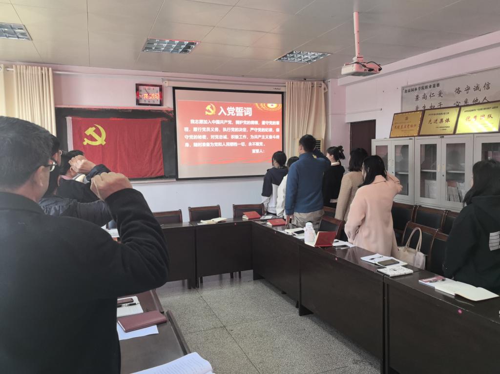 会议进行第四项:全体党员列队面向党旗,由党员刘若凡同志带领全体党员重温入党誓词。