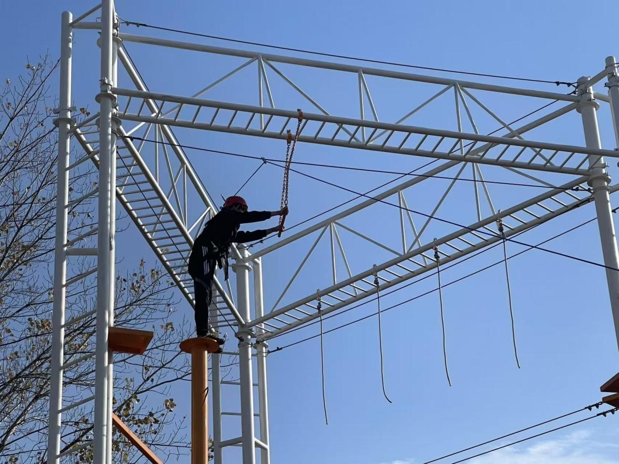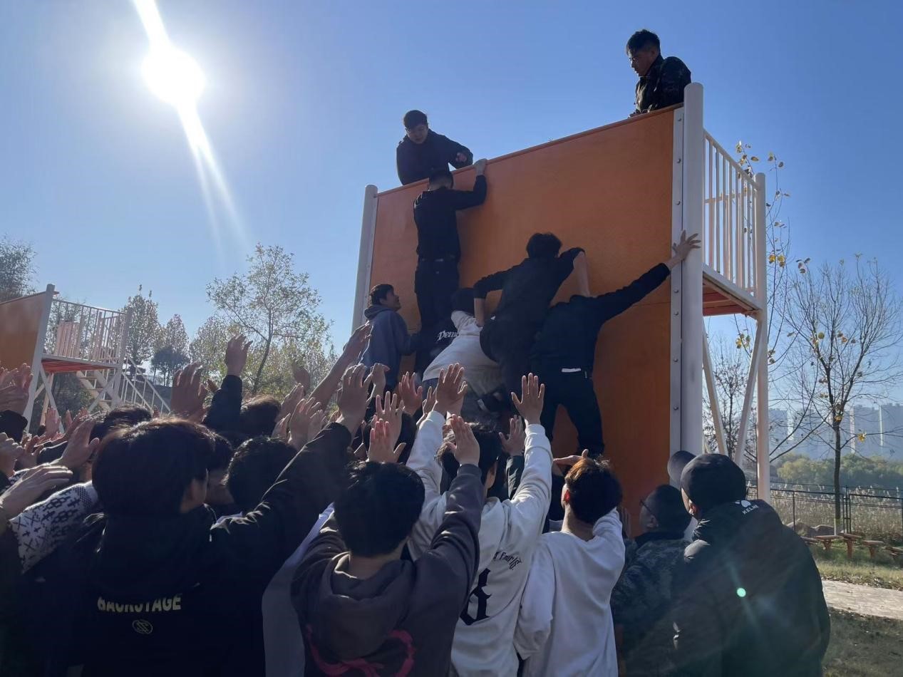 最后面对4米高的“毕业墙”,身体强壮的人主动当人梯,其余人围起来守护安全。同学们奋勇当先,被罚也毫无怨言,当最后一名成功登顶时,所有人都欢欣鼓舞。虽然整个过程并不顺利,但是大家都没有畏惧和退缩,更没有放弃任何人。这个项目也让大家体会到团结合作的重要性,只要大家共同努力,不管多大的困难,都能通过努力实现目标。