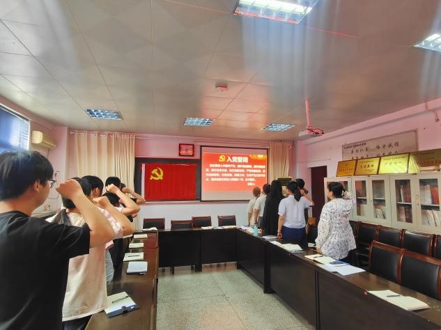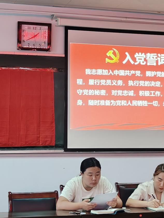 会议进行第五项:全体党员列队面向党旗,由组织委员赵鹏辉同志带领全体党员重温入党誓词。